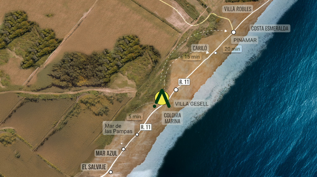 Ubicado al norte de Colonia Marina, a 5 minutos de Mar de las Pampas y 17 minutos de Pinamar.